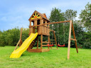 Детский городок Выше Всех Новая Победа 3 это обновлённая модель самого популярного городка, который выпускается с 2015г. и пользуется большой популярностью у наших покупателей. Новая Победа 3 отлично подойдет как для малышей, так и для детей постарше. Малыши могут поиграть в удобной песочнице. Для удобства обустроена лавочка, а для безопасности есть небольшой заборчик, который блокирует случайный выход ребенка из зоны песочницы в сторону качельной балки. Также малыши оценят качели-гнездо.